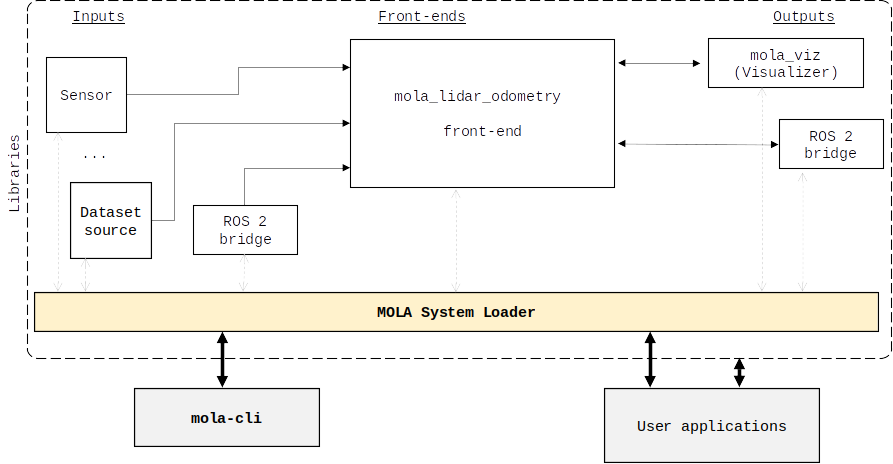 As shown in the figure above, once encapsulated within a MOLA application container, the LO module can take input sensory data from other MOLA input modules, and the live LO output can optionally be either visualized in the mola_viz GUI, and/or published to an external ROS 2 system.